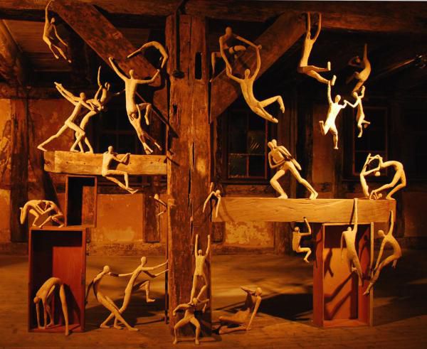 Eine Rauminstallation mit 33 Figuren, die an alten Holzbalken emporstreben.