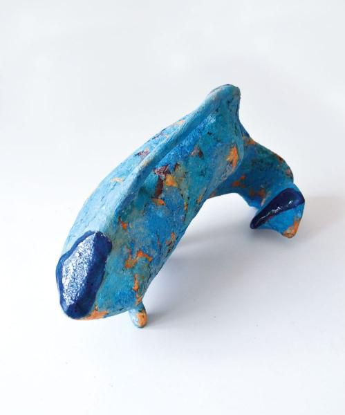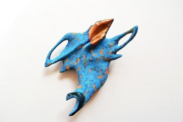 My wallsculptures are modeled with Papierstein®/PaperStone, a trademark material developed by myself. Actual I embedded in my sculptures enameled copper shapes. The metal creates a shiny contrast to the rather rugged Papierstein® material.