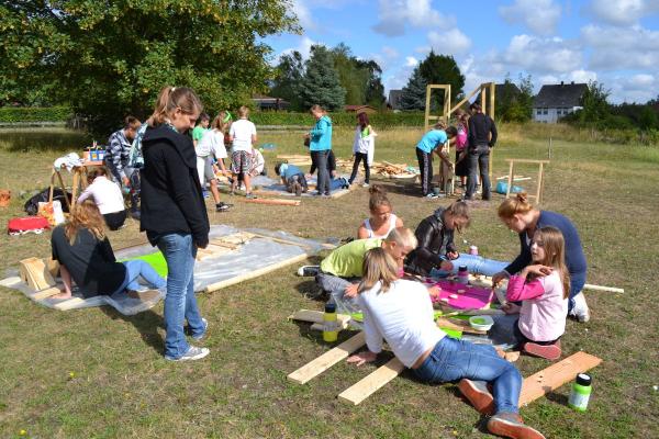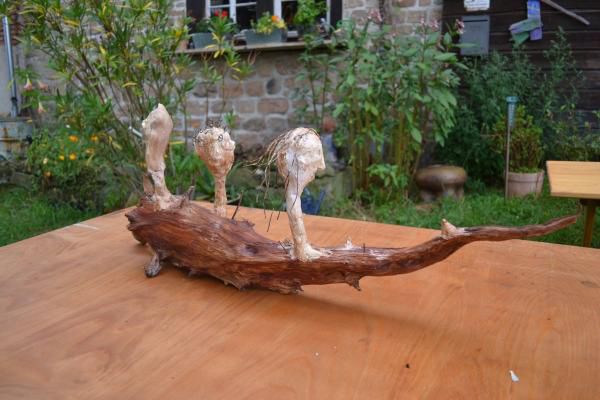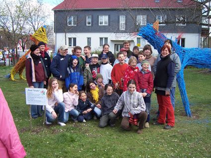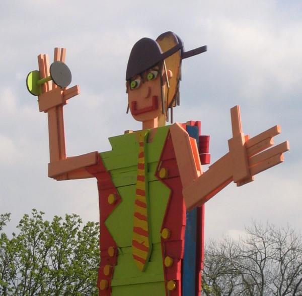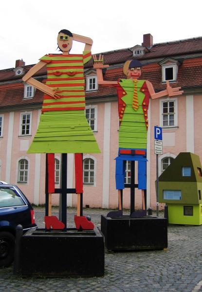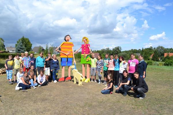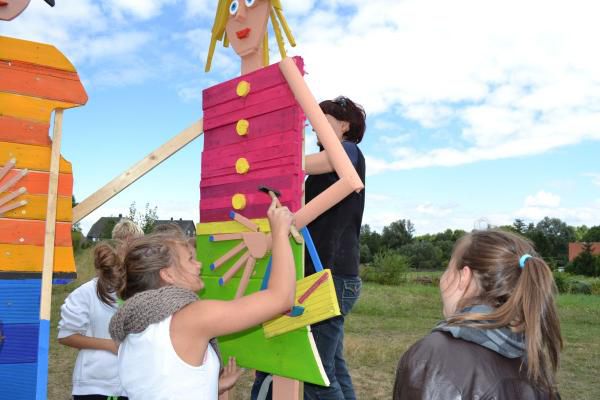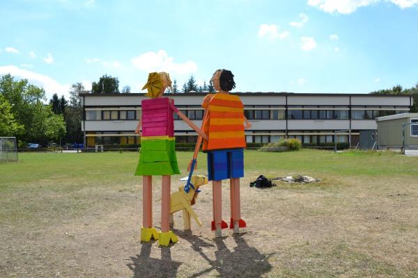 Überlebensgroße Holzplastiken entstanden in 3-4-tägigen Kunstprojekten in Bad Harzburg an der Haupt- und Realschule und an der Weimarer Malschule. Frei nach der Fantasie der Schüler wurden überlebensgroße Holzplastiken, in kreativer Teamarbeit mit verschiedenen Holzbrettern, Stäben, Stücken etc. zusammengenagelt, bis zwei Figuren entstanden, die durch die abschließende farbige Gestaltung Blickfang für den Schulhof und die Umgebung sind.