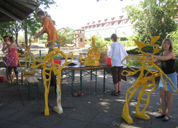 Im Rahmen von 3-tägigen Schul-Kunstprojekten in Bad Harzburg (Haupt-und Realschule), Berlin (Fläming-Grundschule) und in Erfurt (Kunst- und Designschule IMAGO e.V.) wurden künstlerische Objekte gebaut, die in Bäumen auf dem Schulgelände installiert wurden. Dies sind z.B. Käfer, Rieseninsekten, Bienen, Kanarienvögel, Pleitegeier, kleine Drachen. Gebaut aus Stroh in Kombination mit Draht oder Strick werden die Objekte mit Farben bemalt, so dass in den Bäumen ein buntes „Getümmel“ entsteht.